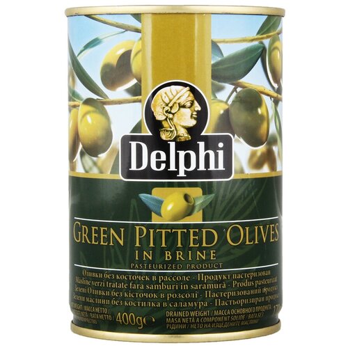 Оливки б/к в рассоле Delphi Superior 261-290 400 г. GREEN PITTED OLIVES IN EO TINS OF 425ML 170GR D.W. IN TRAYS OF 12 SUPERIOR 261/290
