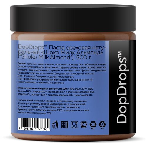 Паста Шоколадная Ореховая DopDrops SHOKO MILK арахисовая с шоколадом и лепестками миндаля без сахара, 500 г