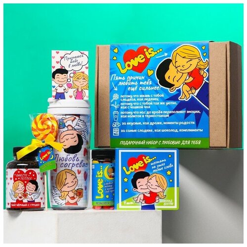 Гифтбокс Love is: чай, драже, шоколад, термостакан, леденец Фабрика счастья 7854989 .