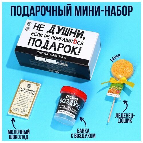 Минигифтбокс «Не душни»: молочный шоколад 27 г, леденец-дошик со вкусом банана 35 г, банка с воздухом