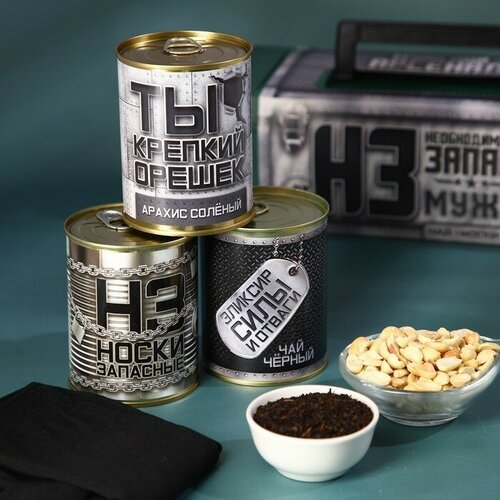 Набор «Необходимый запас» в ящике для инструментов, чай чёрный со вкусом имбиря 60 г., арахис жарный с солью 100 г., носки.