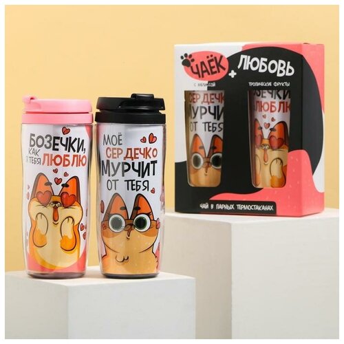 Парные термостаканы с чёрным чаем, 2 шт. х 350 мл. «Чаёк и любовь», мелисса 20 г., тропические фрукты 20 г.