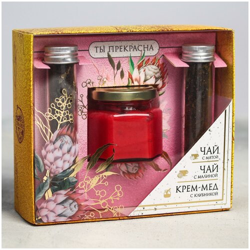 Подарочный набор «Прекрасна». чай. мята/малина. 2 шт. крем-мёд. с клубникой. 120 г 5297716