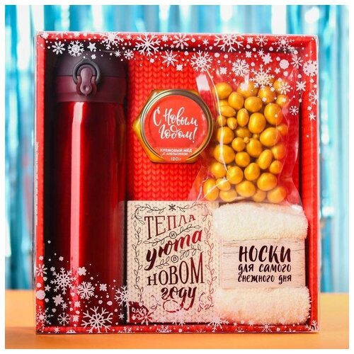 Подарочный набор «Тепла и уюта»: чай 50 г, крем-мед 120 г, носки 36-39 р, термос 500 мл, арахис в глазури 100 г