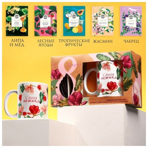 Подарочный набор С 8 марта: чайное ассорти (5 вкусов x 4 шт.), кружка (300 мл) [03] Фабрика счасть