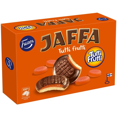 Печенье бисквитное Fazer Jaffa, с мармеладом со вкусом персика и ананаса, покрытое темным шоколадом, 300 г (из Финляндии)