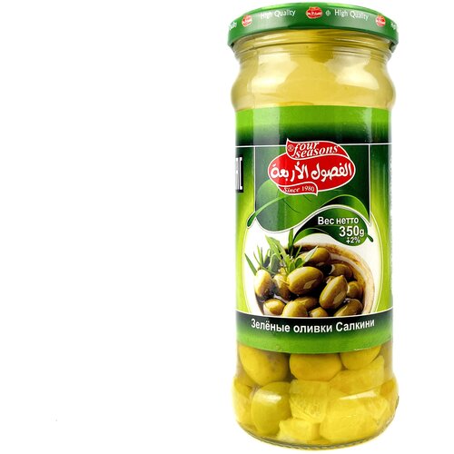 Оливки из Сирии зелёные с косточкой средние Салкини "Четыре сезона" в стеклянной банке 350гр