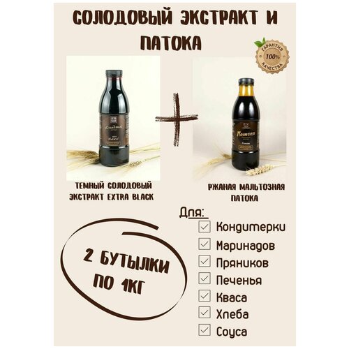 Солодовый экстракт/концентрат EXTRA BLACK и патока ржаная мальтозная. Набор из 2 бутылок по 1кг для хлеба, пряников, кваса, квасное сусло