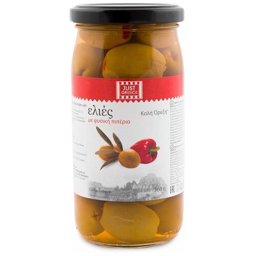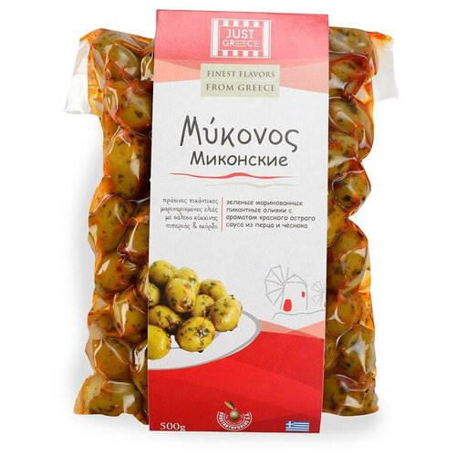 Оливки Джаст Грис Миконские в рассоле перец/чеснок 500г