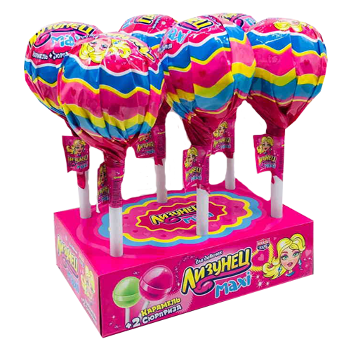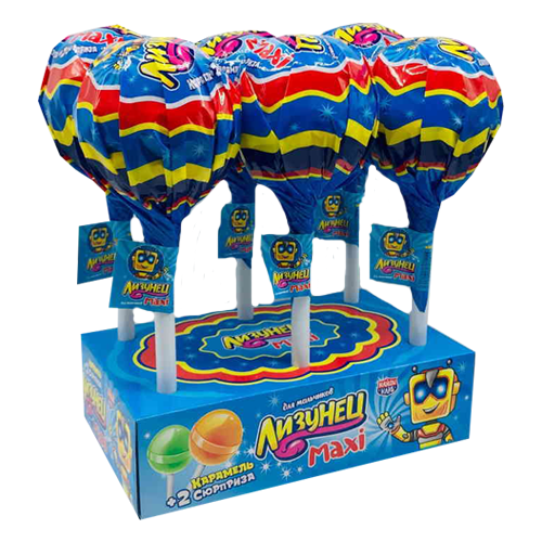 Карамель на палочке с жевательной резинкой и подарком Лизунец MAXI (для мальчика) 125 гр Упаковка 6 шт