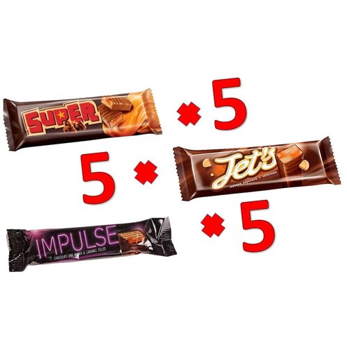 Набор батончиков: Батончик JET S с печеньем и мягкой карамелью+Батончик шоколадный Импульс + Батончик Super