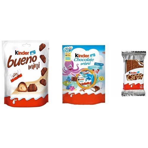 Набор Kinder из трех сладостей (Батончики Bueno Mini 108 гр. + Пирожное Cards 25,6 гр. + Шоколад Schokolade mini 120 гр.)