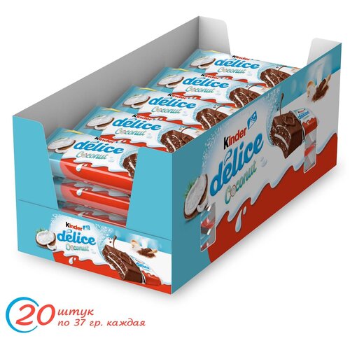 Пирожное Kinder Delice, бисквитное, покрытое какао-глазурью, с кокосовой начинкой, 20 шт по 37 г