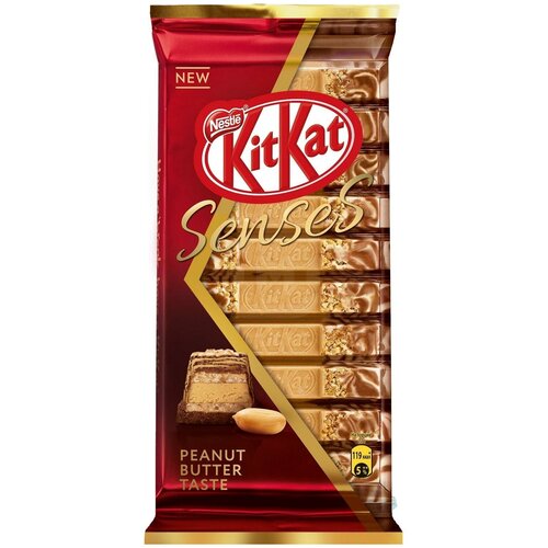 KitKat Senses Молочный и белый шоколад с хрустящей вафлей, начинкой со вкусом арахисовой пасты, декорированный кусочками арахиса. 110г