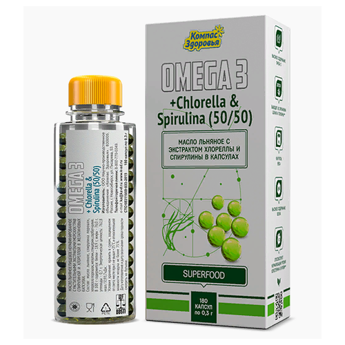 Масло льняное с экстрактом хлореллы и спирулины,180 капсул