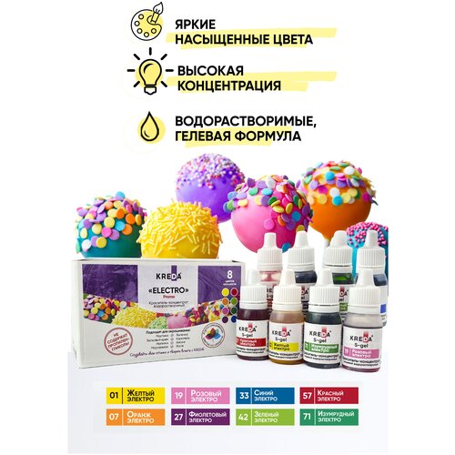 Набор пищевых красителей ELECTRO promo креда (KREDA), 8 цветов S-gel, концентраты гелевые, 8шт* 10мл