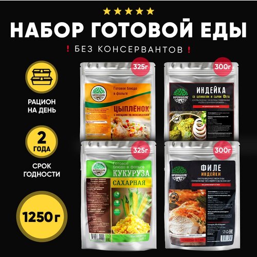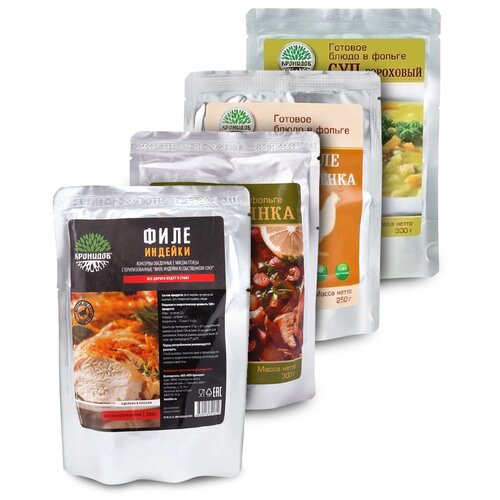 Набор из 4 готовых блюд в реторт-пакете "Кронидов" Цыпленок по-мексикански/Индейка со шпинатом и сыром фета/Кукуруза сахарная в с/с/Филе индейки