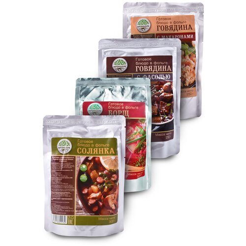Набор из 4 готовых блюд в реторт-пакете "Кронидов" Курица с грибами и сыром/Солянка/Макароны с говядиной/Говядина тушеная высший сорт