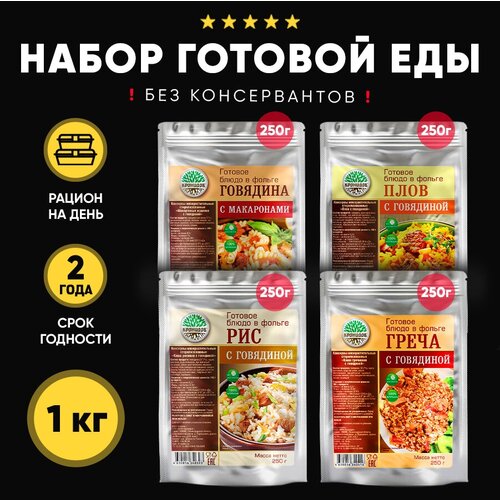 Набор из 4 готовых блюд в реторт-пакете "Кронидов" Говядина с макаронами/Плов с говядиной/Рис с говядиной/Греча с говядиной