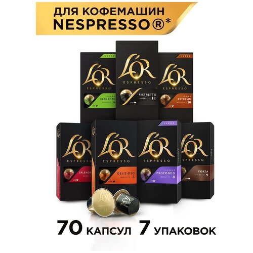 Набор кофе в капсулах L’OR (Delizioso, Forza, Elegante, Estremo, Profondo, Ristretto, Splendente), 10 кап. в уп., 7 упаковок