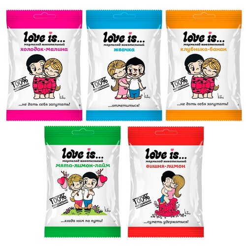 Набор жевательного мармелада Love is холодок-малина + вишня-лимон + мята-лимон-лайм + жвачка + клубника-банан (5 шт. по 25 гр.)