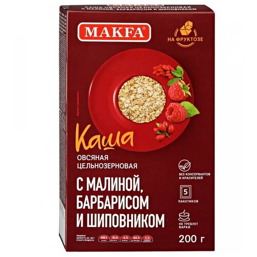 Каша овсяная цельнозерновая моментального приготовления с малиной, барбарисом и шиповником MAKFA, 200г (ШБ 40)