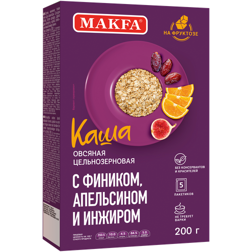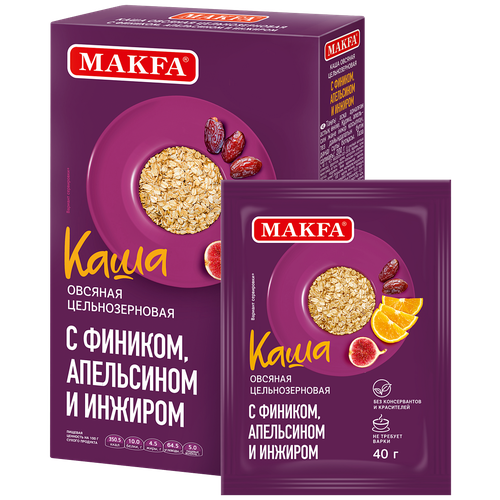 Каша овсяная цельнозерновая моментального приготовления с фиником, апельсином и инжиром MAKFA, 200г (ШБ 40)