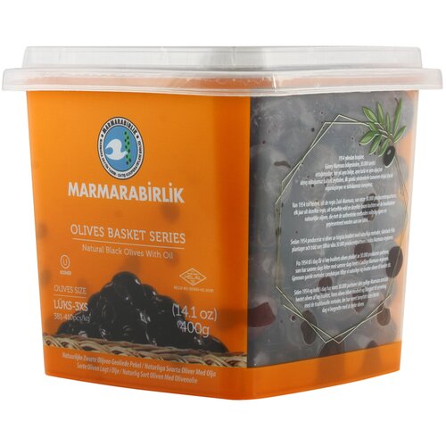 Оливки с маслом черные натуральные MARMARABIRLIK SEPET SERISI 3XS (381-410), с косточкой, пл/б, нетто 410 г