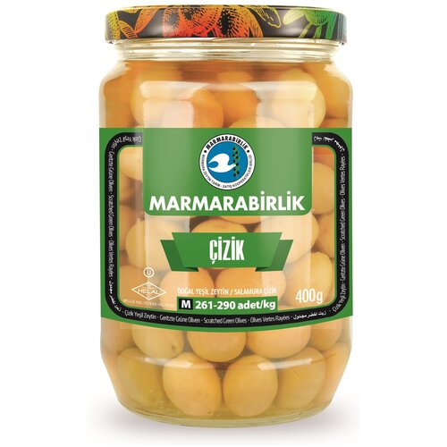 Оливки зеленые натуральные MARMARABIRLIK CIZIK M (261-290) надрезанные, с косточкой в рассоле, ст/б, нетто 710 г