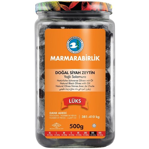 Оливки с маслом черные натуральные MARMARABIRLIK 3XS (381-410), с косточкой, ст/б, нетто 510 г