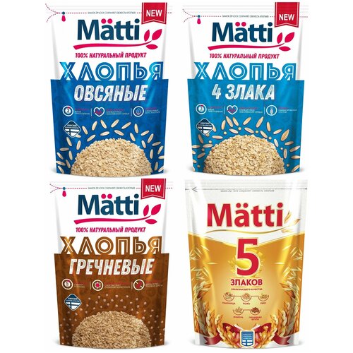 Мультизлаковый набор хлопьев быстрого приготовления Matti (овсяные 400 г + гречневые 375 г + 5 злаков 400 г + 4 злака 400 г), 4 пачки