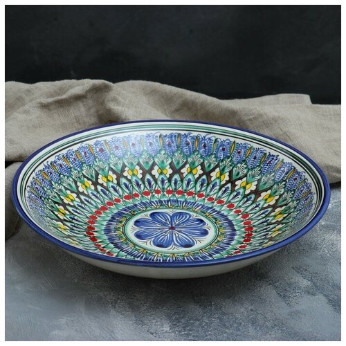 Ляган круглый Риштанская Керамика, 31см, сине-зелёные узоры