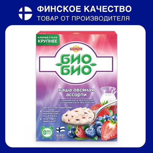 Каша Myllyn Paras Bio-Bio овсяная ассорти с черникой и молоком, с клубникой и молоком, 160г.
