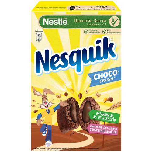 Nesquik®. ChocoCrush. Злаковые подушечки с шоколадной начинкой, обогащенные витаминами и минеральными веществами 220 г