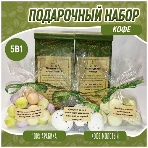 Подарочный набор кофе (2 вида ароматизированного молотого кофе (Ирландский ликер и Ванильно-сливочный вкус) и сладости)