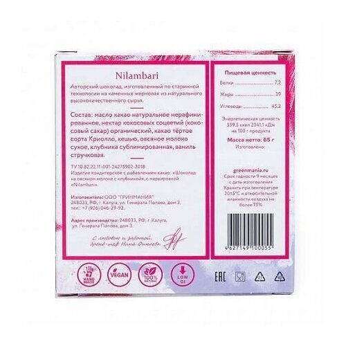 Nilambari Шоколад на овсяном молоке "Клубника", 65 гр