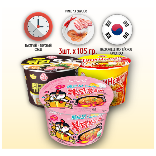 Лапша микс чашка (Джин Рамен острый, Тегим Удон, Хот Чикен Биг Боул Карбонара) 3шт. (110г + 110г + 105г)