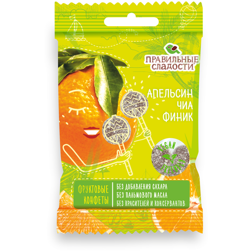 Пермская кондитерская фабрика. Правильные сладости. Фруктовые конфеты Апельсин, Чиа, Финик 50 г, 5 шт