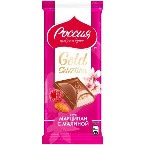 Молочный шоколад «Россия» – щедрая душа! Gold Selection с миндалем с начинкой со вкусом марципана с малиной. 80г