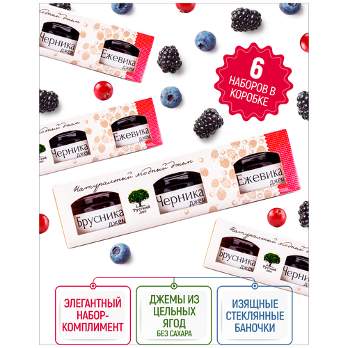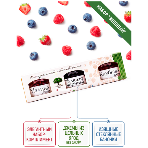Подарочный набор "зеленый" 6 наборов. Джем "Русский лес". Ассорти из порционных баночек (3шт х 25 гр.) В наборе: малина, клубника, клюква/черника.