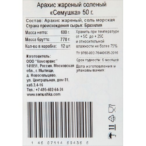 Арахис Семушка жареный соленый, 50гх12шт/уп