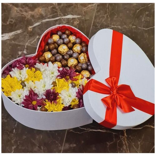Сердце с цветами и конфетами / Хризантемы / Ферреро роше / Конфеты / Букет в коробке / Цветы
