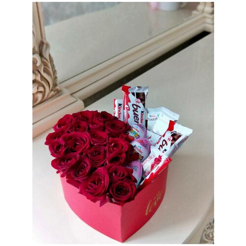 Розы красные / Цветы с шоколадом / Букет в коробке / Киндер шоколад