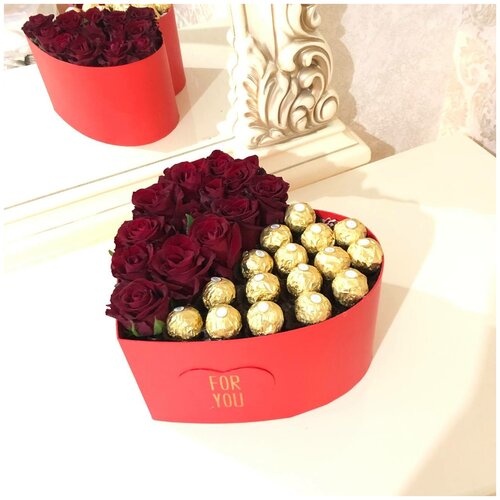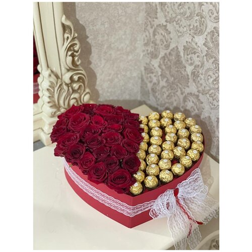 Розы красные 31шт / Цветы с конфетами / Ферреро роше / Подарочный набор / Букет в коробке сердце