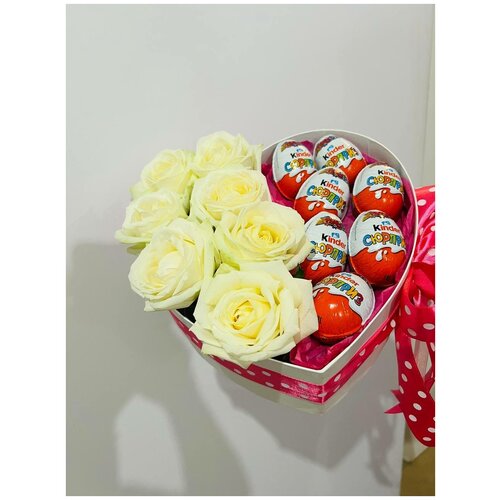 Розы белые с шоколадными яйцами / Цветы со сладостями / Букет в коробке / Подарочный набор / Подарок