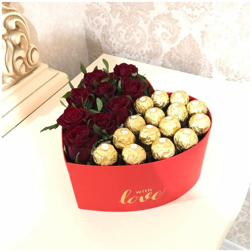 Розы красные 13шт / Букет в коробке / Цветы с конфетами / Подарочный набор / Ферреро роше