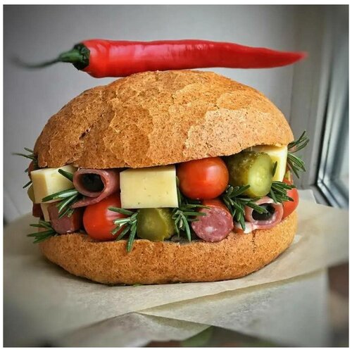 Бургер с колбасой / Бургер с сыром / Мужской бургер / Сыр / Колбаса / Огурчики соленые / Подарок мужчине