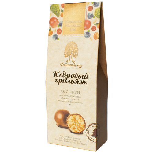 Кедровый грильяж ассорти, 70 г | мини-набор — клюква, облепиха, черника, сосновая шишка, яблоко Сибирский кедр