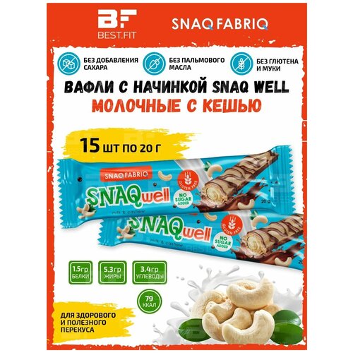 Вафельные батончики Snaq Fabriq SNAQwell без сахара, набор 15шт x 20г (Молочные с кешью) / Низкокалорийные полезные сладости без глютена