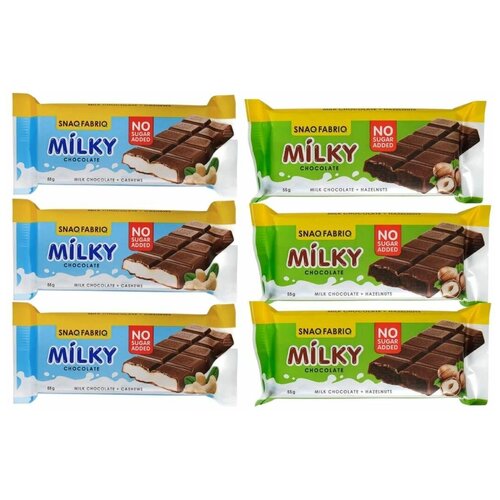 Молочный шоколад Snaq Fabriq Milky без сахара ассорти: с молочно-ореховой и шоколадно-ореховой пастой 55 гр (6 шт)